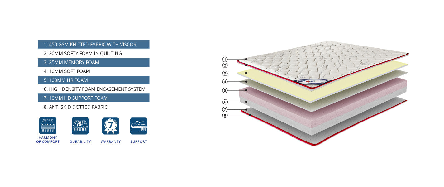 Core constructed with supportive high resilient foam with a comfort layer of top-of-the-line high density, body contouring memory foam.