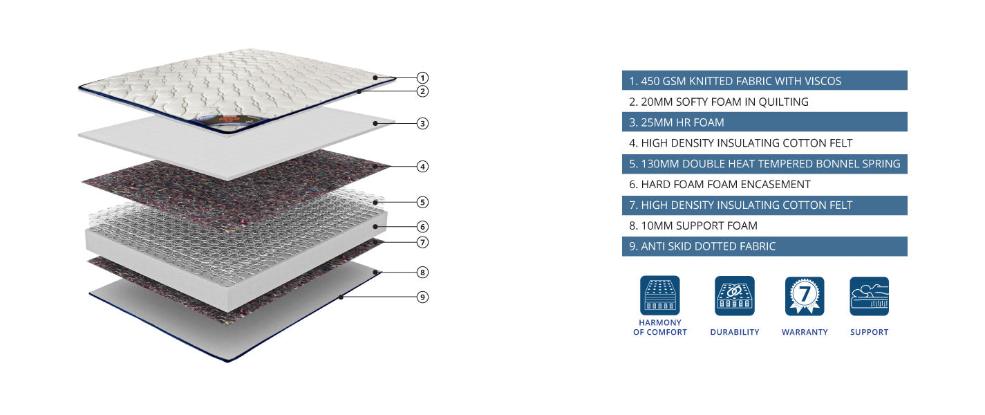 Core made with advanced Chiro Coils and HR foam in comfort layers for excellent back support. Integrated with non-flip technology.